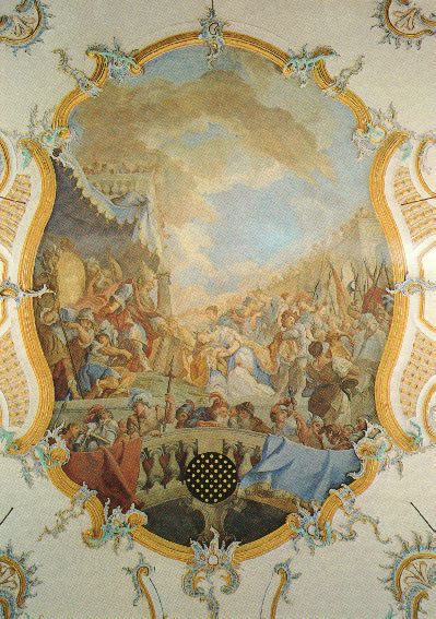 - Das alttestamentliche Vorbild ist im großen Deckengemälde dargestellt: Königin Esther bittet kniefällig für ihr Volk vor ihrem Gemahl, dem Perserkönig Ahasverus. Auch ihre Bitte wird erhört und das dem Untergang geweihte Volk gerettet. Damit ist das Hauptthema der Wallfahrtskirche angesprochen: Wir kommen mit unseren Nöten und Bitten vertrauensvoll zu Maria, die für uns bei ihrem göttlichen Sohn einsteht. Mit ihr stehen wir in der Gemeinschaft der Heiligen, in der alle füreinander da sind. Mit ihr singen wir den Lobpreis Gottes, „der auf die Niedrigkeit seiner Magd herabgeschaut hat“ (Lk 1,48). Mit ihr bekennen wir; daß „seine Barmherzigkeit von Geschlecht zu Geschlecht“ währt (Lk 1,50). Mit ihr wollen wir all jenes „im Herzen bewahren“ (vgl. Lk 2,51), was Gott uns zu unserem Heil geoffenbart und geschenkt hat.