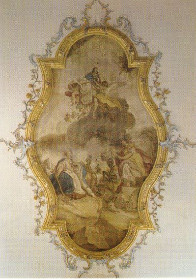 Die vier in der Mitte des 18. Jahrhunderts bekannten Erdteile sind auf dem Deckengemälde durch allegorische Frauenfiguren dargestellt. Die Völker der Kontinente lobpreisen also die Muttergottes. Von links nach rechts sehen wir Europa als vornehme Frau mit blauem Mantel, in der rechten Hand das Kreuz. Hinter ihr ein weißes Pferd. Neben ihr ist Afrika mit einem Papagei auf dem Arm dargestellt. Zu ihren Füßen erkennen wir einen Elefanten. Die Dritte versinnbildlicht den Erdteil Amerika mit einem Federkopfschmuck; vor ihr ein Alligator. Und rechts mit dem Weihrauchgefäß, das Duftwolken des Lobes zum Himmel schickt, ist Asien dargestellt. In ihrem Haarschmuck ist der Halbmond eingeflochten, das Symbol der Astarte und des Islam. Zu ihren Füßen liegt ein Löwe. Indem die Völker bzw. die Kontinente die Gottesmutter preisen, preisen sie letztlich Gott, der an ihr – und an uns – Großes getan hat (Lk 1,49).