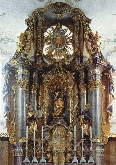 Das Bekenntnis des Glaubens hat sein Herzstück am Hochaltar über dem Gnadenbild. Gott, der Eine und Dreifaltige, hat sich uns geoffenbart. Er ist Liebesgemeinschaft, hingebende Liebe: Lichte Wolken haben sich zurückgezogen, und inmitten Strahlen des ewigen Lichtes sehen wir das Symbol der Dreifaltigkeit, ein gleichschenkliges Dreieck, aus dessen Winkeln je eine Flamme hervorbricht. Die Liebe Gottes offenbart sich in der Geschichte in dem Erlöserwillen Gottes. Die Propheten sind Zeugen der Verheißungen Gottes. Der Prophet Jesaia und König David bezeugen den Heilswillen Gottes: Aus dem Geschlecht Davids wird der Messias, der Erlöser geboren. Und Jesaia vermittelt die Verheißung Gottes einer Zeit, die sich im rein Diesseitigen absichern will: Die Erlösung kommt von Gott allein: Er läßt einen Reis aus Jesses Stumpf sprießen (Jes 11,1). Der Geist des Herrn wird sich auf ihn herniederlassen (Jes 11,2). Er richtet die Gerechtigkeit wieder auf (Jes 11,4), und alle Heidenvölker werden ihn aufsuchen, und wo er weht, ist der Ort herrlich (Jes11,10)